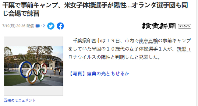 7月19日,据《读卖新闻》,千叶县印西市19日宣布,在市内进行奥运备战的一名美国10多岁的女子体操选手被确认为新冠病毒阳性。