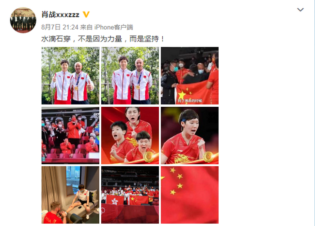 8月7日晚,国乒教练员肖战发文“水滴石穿,不是因为力量,而是坚持! ”